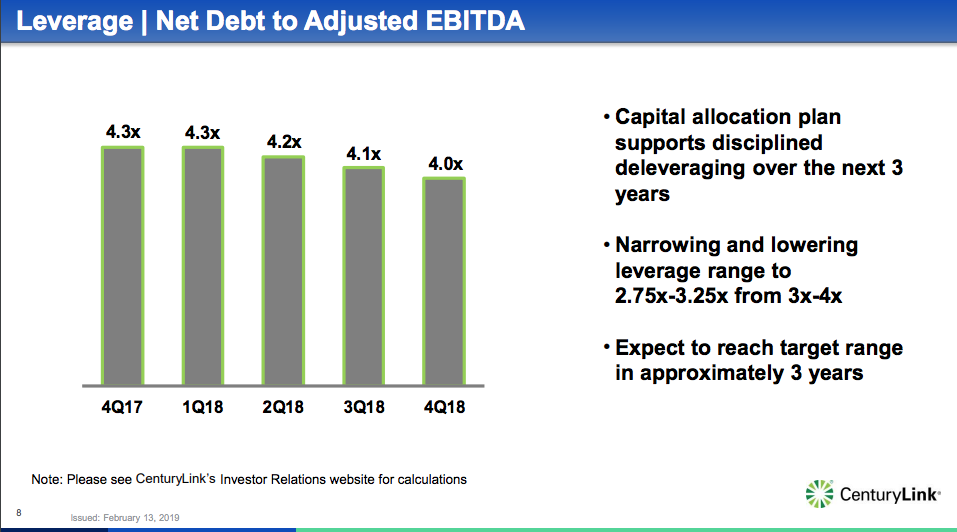 The likely shock to the investor community is that CenturyLink is having any financial problems that would require a dividend cut. According to CEO Jeff Storey on the Q4’18 earnings call, the move was made purely to de-lever the balance sheet quicker: